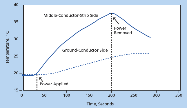 For a test of directionality, the antenna was inserted in a piece of biomedical simulation material, called “phantom” in the art, formulated to have thermal and electromagnetic properties similar to those of human tissue. The phantom was instrumented with two fiber-optic temperature probes: one at 3 mm radially outward from the middle conductor of the CCPW and one 3 mm radially outward from the ground conductor on the opposite side. The catheter was excited with a power of 5 W at a frequency of 2.45 GHz. The temperature measurements, plotted in Figure 2, showed that, as desired, there was considerably more heating on the middle-conductor side. As indicated in Figure 2, the temperature difference between the targeted direction and the back side is about 13°C. This difference is sufficient to provide localized ablation (killing of targeted diseased cells) while preserving the healthy tissue.
