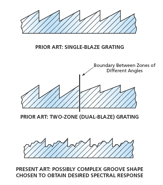 The structured-groove gratings are designed to eliminate the need for multiple blaze zones, which are common in traditional dual-blaze gratings. This simplification allows for uniform treatment of the grating area, enabling designers to optimize imaging performance without the complications of zonal apodization effects that can degrade spectral imaging quality. The document emphasizes that the new gratings can be tailored to match specific spectrometer source illumination and detector responsivity curves, thereby optimizing signal-to-noise ratios and overall imaging performance.