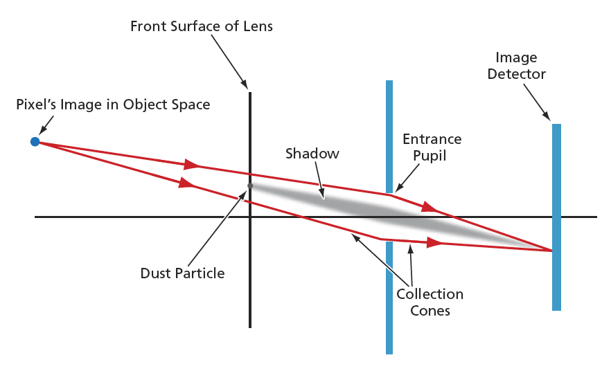 Figure 1. A Geometric-Optics Model of shadowing is used to compute the effects of dust particles onan image. A dust particle can absorb light or scatter light out of some pixels, thereby giving rise to a dark dust artifact. It can also scatter light into other pixels, thereby giving rise to a bright dust artifact. For the sake of simplicity, this model deals only with dark dust artifacts. The model effectively represents dark dust artifacts as an attenuation image consisting of an array of diffuse darkened spots centered at image locations corresponding to the locations of dust particles. The dust artifacts are computationally incorporated into a given test image by simply multiplying the brightness value of each pixel by a transmission factor that incorporates the factor of attenuation, by dust particles, of the light incident on that pixel.