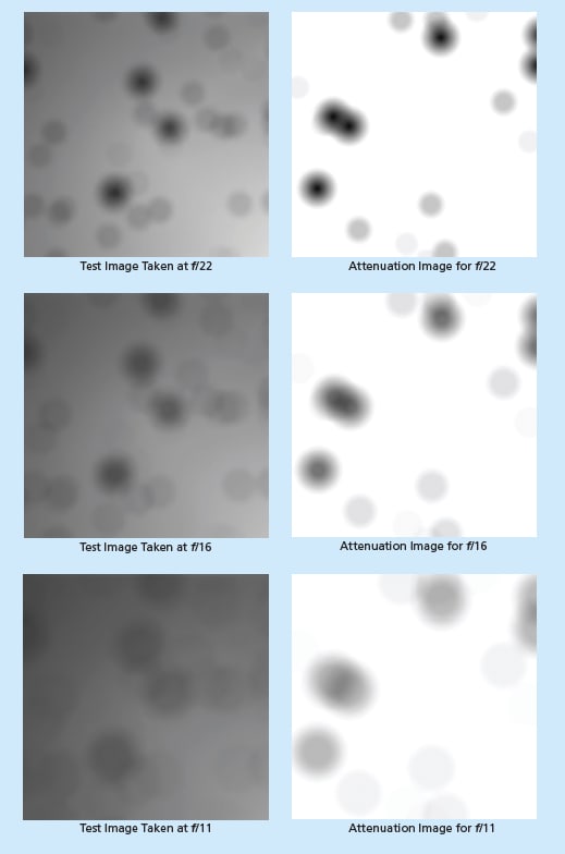 Figure 2. Test Images Containing Dust Artifacts recorded at various relative apertures are shownalongside the corresponding synthetic attenuation images. With respect to computation of the attenuation and transmission factors, the model is based on a first-order geometric (ray)-optics treatment of the shadows cast by dust particles on the image detector. In this model, the light collected by a pixel is deemed to be confined to a pair of cones defined by the location of the pixel's image in object space, the entrance pupil of the lens, and the location of the pixel in the image plane (see Figure 1). For simplicity, it is assumed that the size of a dust particle is somewhat less than the diameter, at the front surface of the lens, of any collection cone containing all or part of that dust particle. Under this assumption, the shape of any individual dust particle artifact is the shape (typically, circular) of the aperture, and the contribution of the particle to the attenuation factor for a given pixel is the fraction of the crosssectional area of the collection cone occupied by the particle. Assuming that dust particles do not overlap, the net transmission factor for a given pixel is calculated as one minus the sum of attenuation factors contributed by all dust particles affecting that pixel.