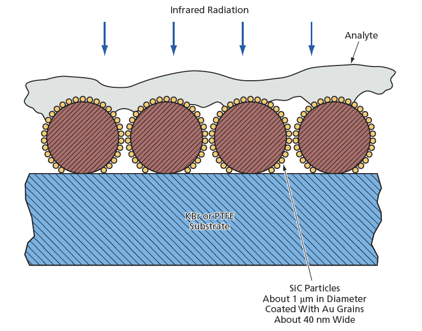 In a test, the infrared spectra of one of the experimental nanostructures described above were measured before and after the nanostructure was coated with an approximately- monomolecular- thickness layer of poly(methyl methacrylate) [PMMA]. Among other things, the measurements showed that in the affected wavelength range, in the presence of the nanostructure, the magnitude of absorption by the thin PMMA film was comparable to the absorption by a considerably thicker PMMA film without the nanostructure.