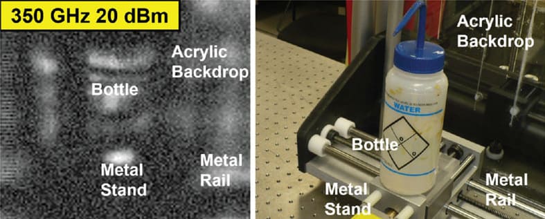 Heat capacity is one of the simplest thermal properties and describes the rise in temperature for a given quantity of energy absorbed. This is similar to “specific heat capacity,” but does not factor the mass term. By simply transmitting continuous mm-wave power into the object and measuring the temperature rise with the observing radiometer, the specific heat can be estimated. The radiometer and exciter need to operate at quite different frequency bands so that interference does not occur, and the coupling between the exciter and radiometer is dominated by thermal transfer, not electromagnetic (harmonics and spurs) coupling. For this sensing approach, the exciter is located at the lower 30 to 40 GHz Ka band where high-power (>10 W) amplifiers are available to deliver useful quantities of power for heating. The radiometer will operate in the 75 to 110 GHz W-band range to provide better resolution as the setup optics will be less diffracted at shorter wavelengths.