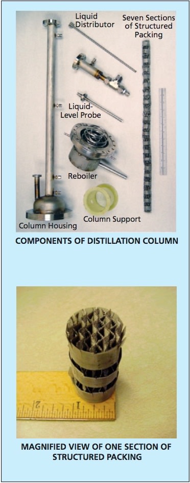 The key components in this column are the structured packing and the distributor. The structured packing is highly compact. Each section of packing is about 1 in. (about 2.5 cm) in diameter and 3 in. (about 7.6 cm) long. The column contains a total of seven sections of packing, so the total length of packing in the column is 21 in. (about 53 cm). The packing promotes transfer of mass between the up-flowing vapor and the down-flowing liquid. The liquid distributor, as its name suggests, helps to distribute the liquid as nearly evenly as possible throughout the cross section of the column so as to utilize the packing to the fullest extent possible and thereby maximize the mass-transfer effectiveness of the column.