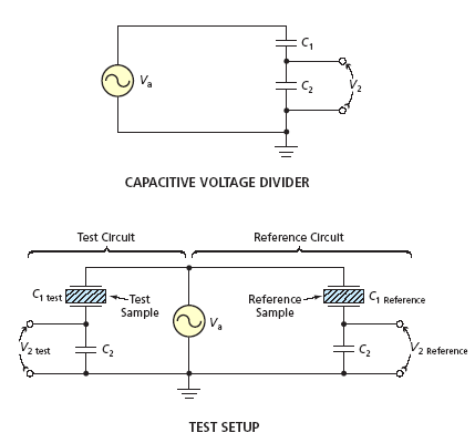 The volume enclosed by the top, bottom, and guard electrodes of C1 constitutes a sample cell. A material sample, having relative permittivity k at the frequency of interest, is placed in the sample cell. The exact shape and size of the sample volume is not critical and can be chosen to fit the material sample. What is critical is that (a) C2 in both circuits be identical and (b) the sample cell in the test circuit have the same size and shape as that in the reference circuit, so that the capacitances of the two sample cells are proportional to the permittivities of their contents. Then the capacitances of the two sample cells are given by