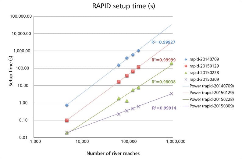 The development of RAPID has been ongoing for almost a decade. The main improvement made here (see figure) over previous versions of the software are in code modifications, allowing for the decrease of model setup time from hours to mere seconds when addressing continental-scale applications. This means that RAPID can now start producing results virtually instantly after launching the executable. The lengthy setup times had previously been a major impediment to large-scale applications (continental to global simulations) of RAPID.