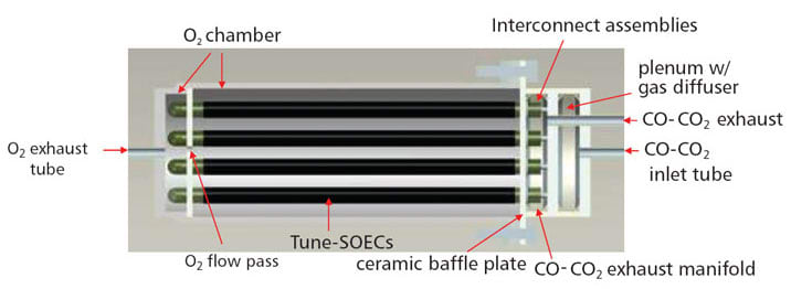 The nature of tubular design enables the assembly of tubes in modules of a convenient size in a lightweight fashion with minimum concerns over sealability. A further increase in capacity could be achieved through electrical connection of multiple modules. In this way, systems for a wide range of applications and/or scales could be assembled, and the reliability of large installments could be quite high since single modules could be serviced or replaced as needed. Thus, the design of the prototype O2-CO cogeneration system was refined, and key elements were identified for the construction of cogeneration bundles.