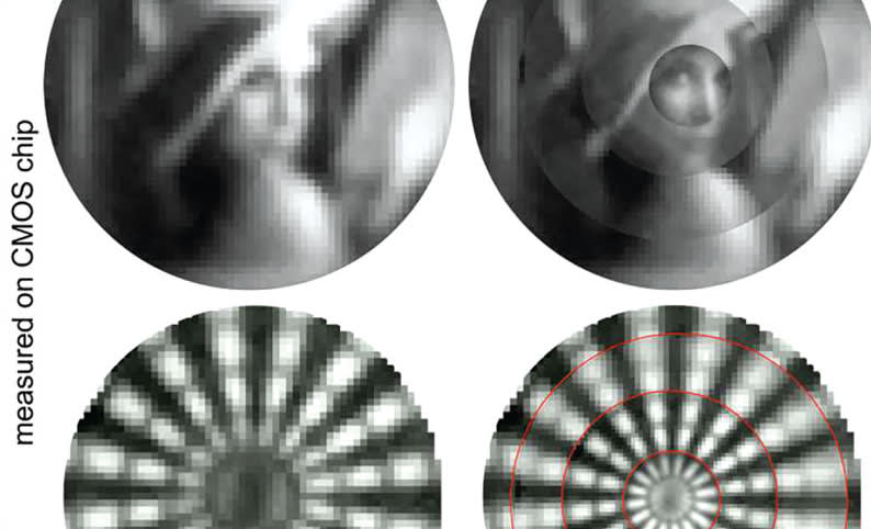 The imaging system's lenses were printed onto a CMOS chip to form the multi-aperture camera. The CMOS sensor is 2x3 mm2, but sensor chips are available in 1x1 mm2. The lenses have diameters of 125 μm and are roughly the same height – about the size of a grain of sand.