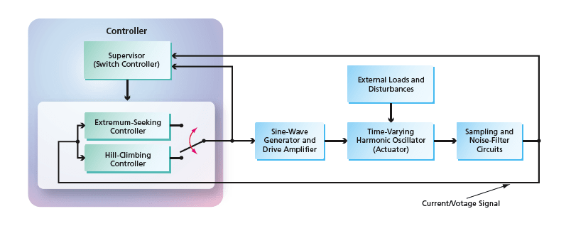 Once the excitation frequency has begun to oscillate about the peak, the supervisory algorithm switches operation to the ESC algorithm, which uses past as well as present input/output data to make a least-squares estimate of the resonance frequency. The estimation task involves updating two scalar parameters of a quadratic model that represents the input/output map of the actuator resonance. After each sampling period, the new input/output data pair is added to the collection of past data pairs, such that information regarding the input/output relationship of the actuator increases over time; in other words, as the input/output information comes in, the algorithm tries to improve the fit between the quadratic model near resonance and all the past input/output data up to the current time. Once the estimated parameters have converged sufficiently, the excitation frequency is updated according to a simple formula that represents a maximizer associated with the quadratic model. In the event that the estimates begin to diverge beyond a specified limit, the supervisory algorithm switches operation back to the hill-climbing algorithm.