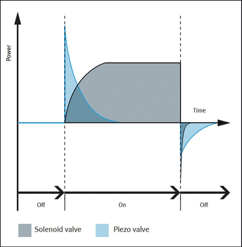 Low energy consumption and no heat generation: Thanks to their capacitive principle, piezo valves require virtually no energy to maintain an active state. The valves do not generate heat if high-frequency control is not used (because that requires frequent switch-on energy). The energy balance increases along with the required switching frequency. Piezo technology is ideal for use in the “very-low-power” range of battery-powered devices (Figure 2).