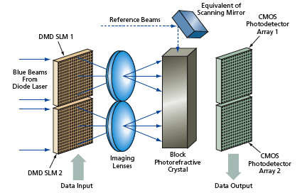 The new holographic memory (HM) system architecture incorporates a multilevel Spatial Light Modulator (SLM), specifically a Deformable Mirror Device (DMDSLM) from Texas Instruments, which enables high-speed data input conversion of up to 12 bits. This is complemented by a CMOS photo detector array for data readout, a beam steering device (such as a liquid crystal phase array or high-speed MEMS mirror), and photorefractive crystals for data recording. The system utilizes time-multiplexing and multilevel DMDSLM technology to record multi-bit holograms, resulting in substantial increases in storage density—up to 8 terabytes for 3-bit holograms and 256 terabytes for 8-bit holograms.