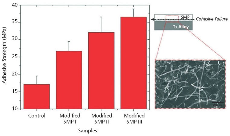 NASA Langley Research Center has developed technology to increase the adhesive strength between shape memory polymer composites (SMPs) and metal alloys. Shape memory materials, including SMPs, have been explored for numerous applications because of their unique shape memory capabilities. These materials can change shape and/or other properties in response to changes in an external stimulus such as stress, temperature, or an electric field.