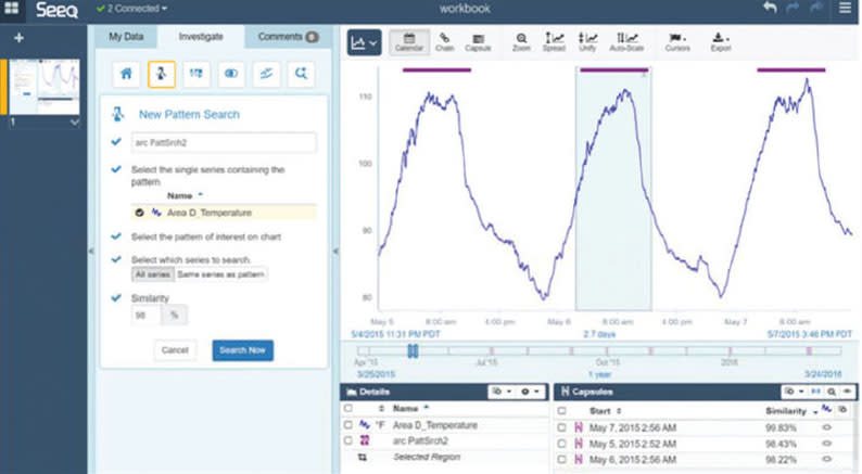 Seeq enables several types of searches on time series data; in this case, the shape or pattern of the signal has been defined as the search criterion, and instances where that pattern occurs are identified by the solid horizontal lines at the top of the trend viewer, known as “capsules.” These capsules, individually or as a group, are the basis for managing and interacting with time periods of interest in the data.