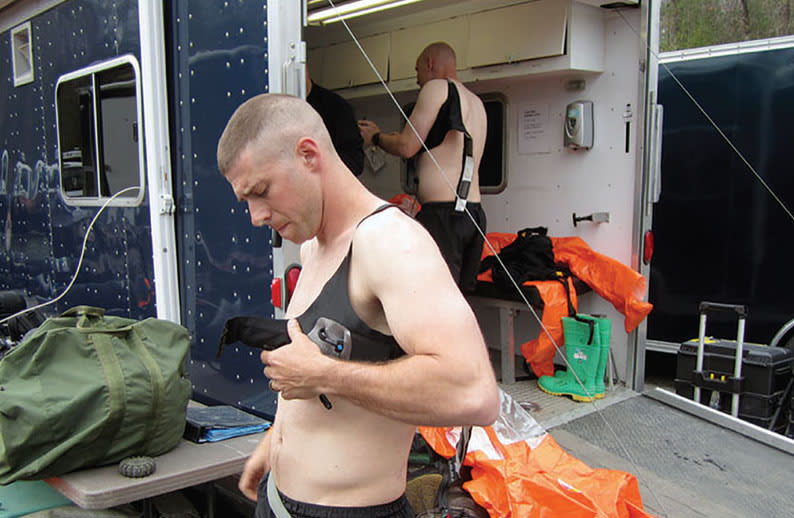 The Army National Guard (ARNG), an early adopter of thermal- or works-train monitoring, is working with the USARIEM and Massachusetts Institute of Technology (MIT) Lincoln Laboratory to define requirements and concepts of operation. The ARNG's Weapons of Mass Destruction Civil Support Teams (WMD-CSTs) train and respond to emergency events in full chemical, biological, radiological, nuclear, and explosive protective gear. Chest-mounted physiological sensors provide work- and heat-strain data to downrange team members and to leaders at a command post. Other applications include the use of wearable sensors to quantify human thermal or work strain during field evaluations of new jungle uniforms performed by the Marine Expeditionary Rifle Squad “Gruntworks,” the human systems integration center at the Marine Corps Jungle Warfare Training Center in Okinawa, Japan.