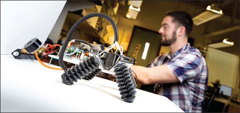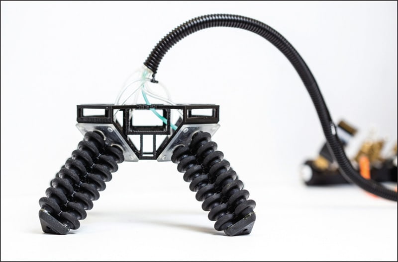 Drotman used a commercial printer, the Connex3 3D printer from the Eden Prairie, MN-based manufacturer Stratasys. By employing multiple materials — both soft and rigid — the team created robotic parts with much more complex geometries, including bellow-shaped actuators that extend farther than simple tubular designs.