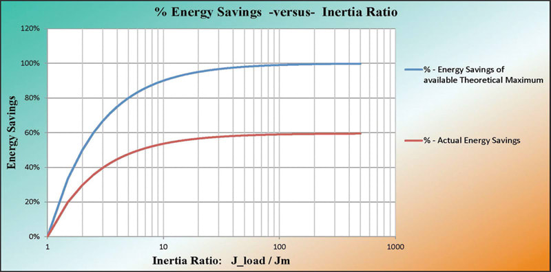 The potential energy savings of any dynamic servo axis can be determined by a comparison of its inertia ratio, where all acceleration and deceleration energy is transmitted to the load (J_load/Jm=∞), against the maximum power transfer ratio (J_load/Jm=1), where only half the acceleration and deceleration energy is transmitted to the load. Maximum energy savings is best achieved with a minimal Jm (theoretically when J_load/Jm=∞, not a matched J_load to Jm).