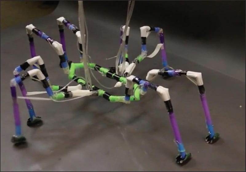 Although the researchers could replicate ants’ distinctive “triangle” gait using their six-legged robot, duplicating a spider-like gait was trickier. “A spider has the ability to modulate the speed at which it extends and contracts its joints to carefully time which limbs are moving forward or backward at any moment,” Nemiroski said. “But in our case, the joints’ motion is binary due to the simplicity of our valving system. Either you switch the valve to the pressure source to inflate the balloon in the joint, and thus extend the limb, or you switch the valve to atmosphere to deflate the joint and thus retract the limb.”