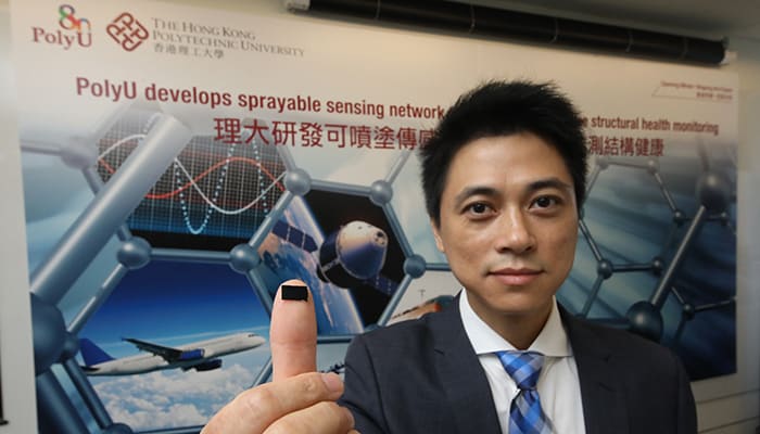 The sensors can also be sprayed on the surface of a moving structure to transmit the structural health information in a real-time manner. Each sensor is connected to a network via a wire printed on the structure. By analyzing and comparing the electrical signals converted from the electric resistivity, the network can spot the defect in a structure, as well as translate the signals into 3D images.