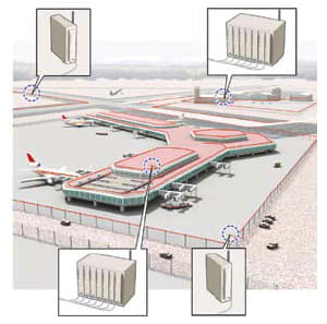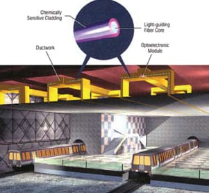 Uses for the DICAST cables abound in security and industrial applications. They can be used to protect buildings and structures, like subway stations, automotive tunnels, high-rise office buildings, arenas, and convention centers, when employed in ventilation ducts, stairwells, or even in large open spaces. The reduction in complexity and increased security provided by these continuous-cable chemical detection sensors make the DICAST system an ideal choice for these applications. A single cable running through a main return air duct, for example, is a more cost effective and efficient method for chemical detection than the installation of point sensors in each room's inlet to that duct.