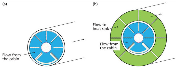 The heat exchanger is a double pipe (or tube in a tube) heat exchanger. The inner tube takes the warm water from the spacecraft, cools it, and returns it to the spacecraft, rejecting its heat. The outer pipe picks up the heat load from the spacecraft and carries it to the radiator, which rejects it to space. The inner tube has fins to help efficiently transfer heat to the wall; however, the space between two of the fins is insulated (from both the wall and the fins) so it stays warm and never freezes. When the heat exchanger is transferring its maximum load to the fluid in the outer tube, it stays fully melted; however, when the load drops, the water in the inner pipe will drop to freezing towards the end of the heat exchanger (the coldest end), and will start to freeze on the walls and the fins. This layer of ice is an insulator, and the heat flux through this section drops dramatically. If the heat load continues to drop, more and more of the inner heat exchanger freezes, and the flux to the heat rejection system drops as well. Finally, at the minimum heat flux, little more than the insulated path remains open.