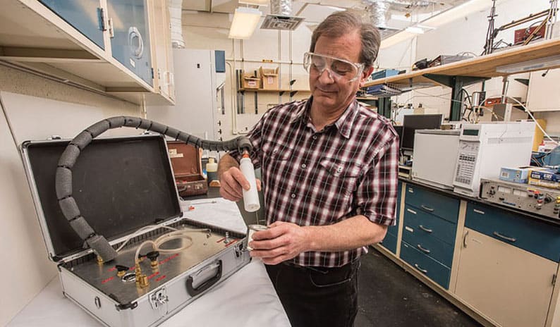 The vapor collection method developed in this work involves the dynamic adsorption of headspace vapors on short porous layer open tubular (PLOT) columns maintained at low temperature (as low as −40 °C). The underlying PLOT-cryoadsorption, or PLOT-cryo, is sensitive, quantitative, and more broadly useful than many competing techniques. It can identify compounds that don’t readily evaporate, and is not limited to samples dissolved in water, for example. The method recovers vapors by suction or by sweeping a gas across the air above a sample of interest. The benefits of this method are many. The collection sensitivity is high — below 1 part per billion (ppb). The low temperature is achieved using a vortex tube connected to compressed air; it has no moving parts, and is attractive for use in environments with explosive or flammable materials.