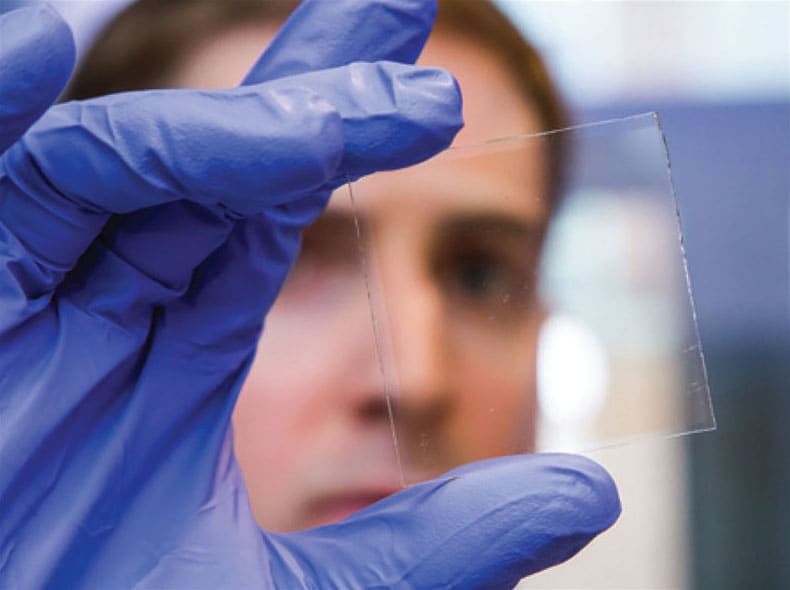 Smart windows equipped with controllable glazing require power for operation, so they are relatively complicated to install in existing buildings. Princeton University researchers developed a different type of smart window: a self-powered version that would be inexpensive and easy to apply to existing windows. This system features solar cells that selectively absorb near-ultraviolet light, making the windows completely self-powered. The smart window is constructed of electrochromic polymers that control the tint and can be operated solely using power produced by the solar cell. When near-UV light from the Sun generates an electrical charge in the solar cell, a reaction in the window causes it to change from clear to dark blue.