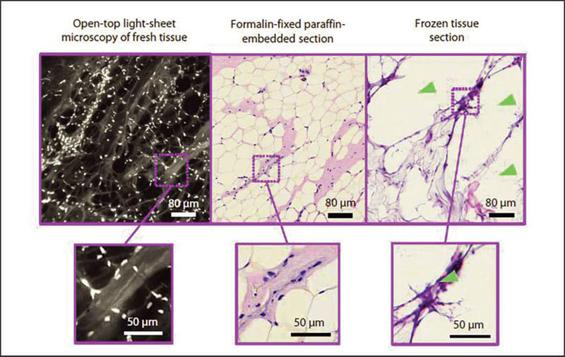 Another technique to provide real-time information during surgeries involves freezing and slicing the tissue for quick viewing. But the quality of those images is inconsistent, and certain fatty tissues, such as those from the breast, do not freeze well enough to reliably use the technique.