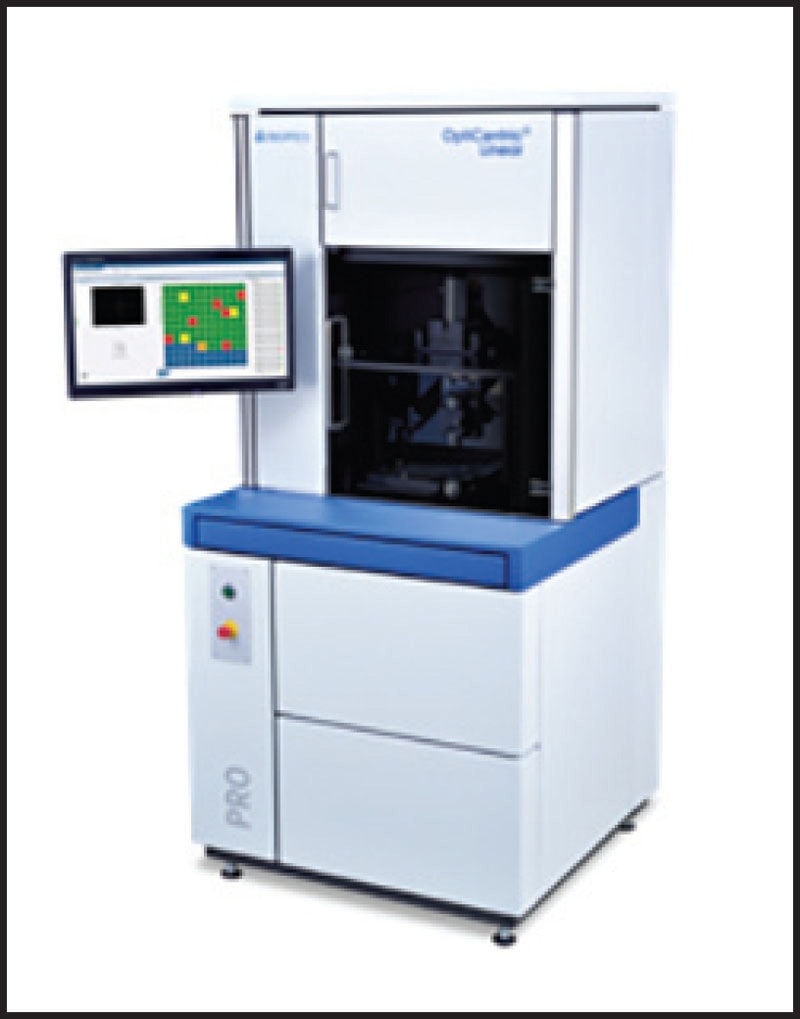 The OptiCentric® Linear PRO centering measurement system from TRIOPTICS GmbH (Wedel, Germany) can determine the centering of lens systems without rotating the sample. An entire series of lens systems can be positioned on a 150 mm x 150 mm tray and checked in one measurement step. Rotation-free measurement takes approximately 6.5 seconds for the centering test of a doublet, which is ideal for production applications.