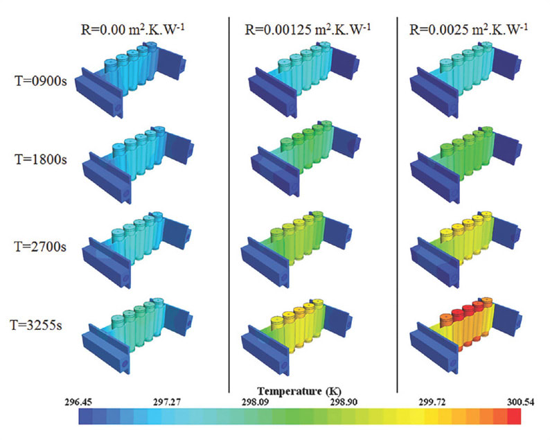 Contact resistance at the solid-state interfaces has proven a major source of problems in large battery pack designs. In this TMS model, thermal contact resistance at the conduction element channel and cell conduction element interfaces were found to be the largest hindrance, resulting in temperature discontinuities, as shown in Figure 4. However, it was found that contact resistance could be reduced by use of thermal interface material at the solid-solid interfaces, which greatly improved thermal performance.