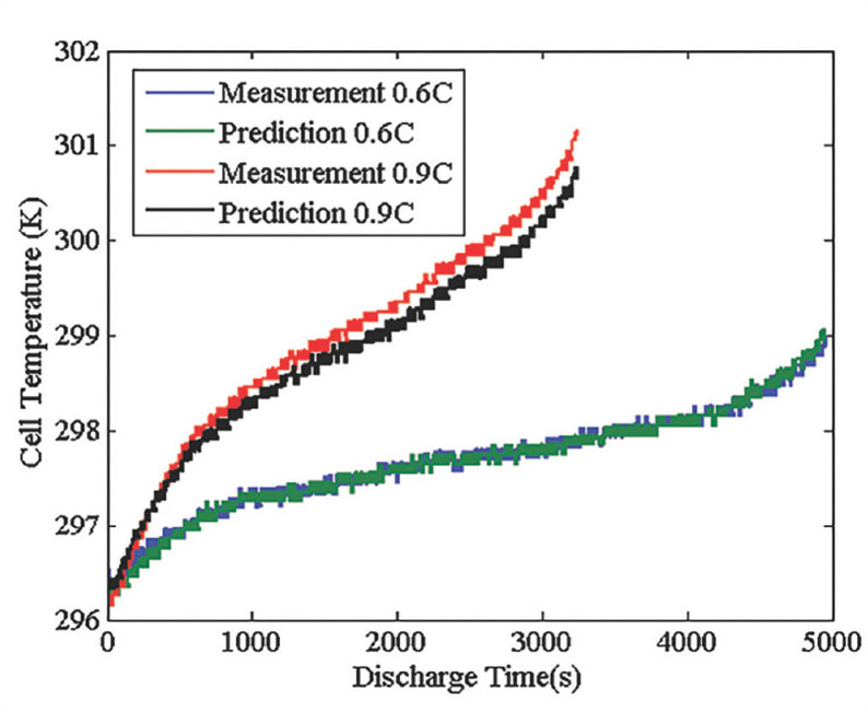 Only the first parallel connected branch (consisting of five cells) and first series connected branch (consisting of six cells) were used in two separate computational models to incorporate the complete electrochemical thermal model. Because the heat generation and transfer mechanism remained the same for all branches, temperature distribution in the first parallel branch could be used to predict temperature distribution in all other branches. Therefore, temperature information from the series-connected cells could be used along with temperature of the first set of parallel connected branches to predict temperature of the entire pack. Using temperature coefficients from these results and input temperature of the first cell (T1 in Figure 2), the temperature of the last cell (T2 in Figure 2) was predicted with high accuracy, as shown in Figure 3.