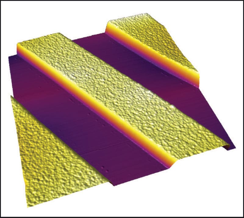 The example topography image in Figure 2 emphasizes that AFM images are 3D surface profiles with quantitative data, not 2D projections subject to interpretation. They thus lend themselves to a wide range of analysis and display options, many of which are pre-programmed in software on newer AFMs. For example, image metrics that correlate with performance or processing variables can be determined quickly and easily.