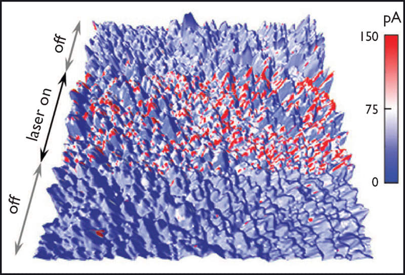 AFM modes that probe electrical properties include conductive AFM (CAFM), electrostatic force microscopy (EFM), and Kelvin probe force microscopy (KFPM). The example in Figure 4 shows CAFM evaluation of a photoactive film. The nanoscale information provided by these techniques is often complementary to that obtained by probe station methods, which test a whole device. AFM electrical techniques can also be used to assess uniformity, identify defects, and otherwise assure quality.