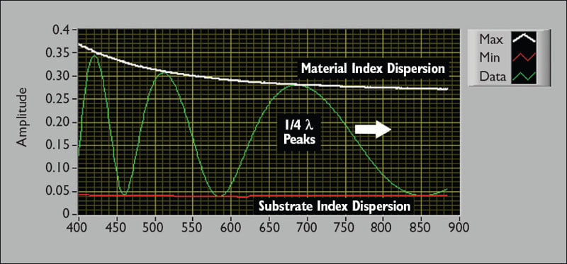 Index dispersion is the variation of refractive index of a material as a function of wavelength. The new monitoring system is based on this unique technology and is called “index dispersion enhanced monitoring,” or IDEM. It produces optical coatings that precisely match the optical design every time, without iteration or error. It gives the user the ability to match the true index dispersion of each deposition material and the individual coating chamber characteristics, making it possible for the thin film design to match the actual coating produced (Figure 2).