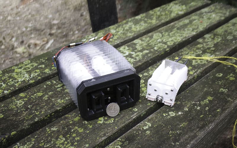 Wissa: Perri, the larger robot, is powered using a lithium polymer (LiPo) battery that is mounted on the robot. The battery powers a servomotor, which turns the base of the origami tower. The robot is controlled with an Arduino board, also mounted on the robot. Thus, the robot is untethered, with all its power source and controls onboard.