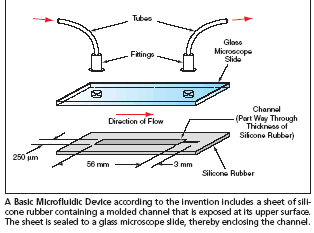 The figure presents a schematic exploded view of a basic microfluidic device according to the invention. The device includes a sheet of polydimethylsiloxane (silicone rubber) that contains the channel and that is sealed to a glass microscope slide. In order to make this sheet, one first makes a mold that comprises a flat surface from which protrudes a ridge having the dimensions of the channel. The mold can be fabricated photolithographically on an oxidized silicon substrate. The silicone-rubber sheet is formed by casting the mixture of silicone-rubber ingredients on the mold.