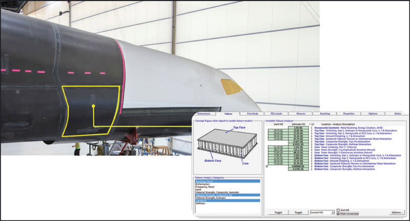 For the massive Stratolaunch wing, deflection limits were a significant factor to be taken into account. The panels of the dual fuselages were sized for strength, stability, and honeycomb sandwich failure modes. Using HyperSizer, the stress team had access to automated failure analyses that include rapid free-body analysis; discrete laminate sizing; ply-based composite failure analysis; honeycomb sandwich analysis methods such as wrinkling, core shear, flatwise tension, and intracell dimpling; and scripting API to push in loads from Excel spreadsheets.