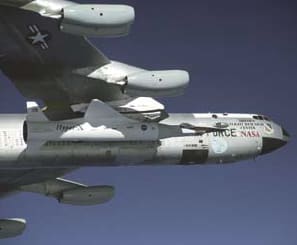 The major experimental feature of this particular aircraft was a scramjet engine, which kicks in at about Mach 6. In a normal jet engine, blades compress the air, but in the scramjet, the combustion of hydrogen fuel in a stream of air is compressed by the high speed of the aircraft itself. To achieve Mach 10, the X-43A was first carried up into the air attached to a B-52 and then “jumpstarted” with a Pegasus rocket.
