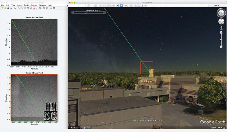 A feature of LASSOS that makes it particularly effective is its integration with Google Earth. As soon as a laser is detected by the cameras, a digital reconstruction of the streak appears on a Google Earth map in real-time. This image summarizes the detection event, depicting the laser's point-of-origin and most probable path through the night sky. Within 30 seconds of the image being captured, LASSOS provides nearby members of law enforcement with the perpetrator's GPS coordinates, nearest address, and the time of the incident. This information allows officers to rapidly intervene.