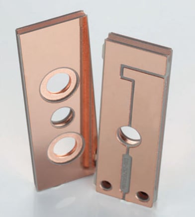 CoolPerformance Plus coolers build upon the cooling approach employed in Rogers Curamik CoolPerformance coolers. Both types of coolers feature several layers of pure copper. The copper foils are formed into hermetic, three-dimensional microchannel or macrochannel water-cooled structures capable of dissipating large amounts of heat in small areas. In addition, they also have aluminum-nitride (AlN) isolation layers, which separate the cooling water channels from the electrical contacts of the laser diodes. They provide a close match in coefficient of thermal expansion (CTE), in the range of 6 to 7 ppm/K, between the copper cooling structures and the laser diode packages.