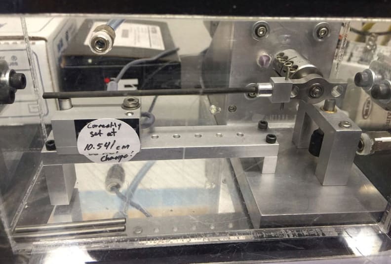 The bearing tester combines a high-quality, low-capacity load cell with an aligned carbon fiber “torque multiplier” arm. The bearing is inserted into a cartridge where a servomotor rotates the inner bearing race smoothly and repeatedly. This device is encased in an airtight environmental chamber to provide the ability to shield the tester with a cover gas during testing. This allows for use with bearings lubricated with oxygen or moisture-sensitive lubricants.