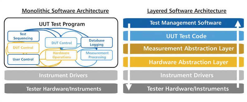 Don't get locked into an inflexible test program by building a monolithic architecture; instead, plan ahead by building layers that perform separate test operations.