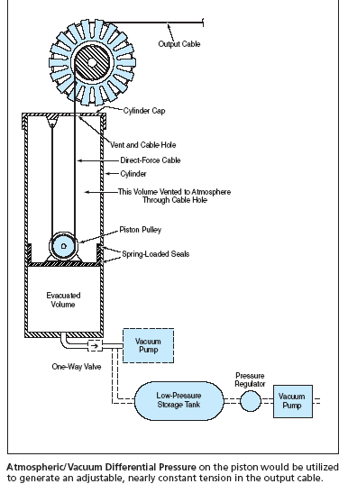 Alternatively, a vacuum could be generated and maintained by use of a small manual or electric vacuum pump. Still another alternative is to connect the lower cylinder volume to the combination of a low-pressure storage tank, pressure regulator, and vacuum pump. This combination could be used to maintain the lower cylinder volume at a subatmospheric pressure (partial vacuum) that could be controlled to set the differential pressure and thus the output-cable tension at a desired level.