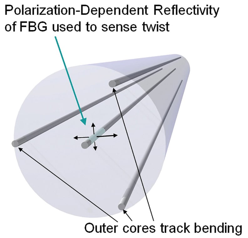 A method was developed for concurrently measuring bending and twisting along an optical fiber using only the properties of light guided within the fiber. The method exploits polarization-dependent reflectivity from fiber Bragg gratings (FBGs) in a centrally located core (see figure). This polarization-based approach fundamentally separates the detection of fiber bending and fiber twist, and no twist bias must be applied during fiber draw.