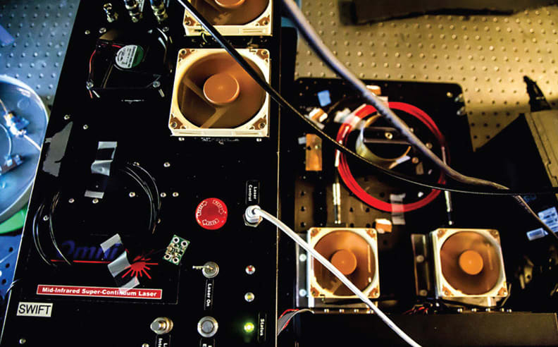 In a process known as “supercontinuum generation,” the wavelengths covered by that light were expanded by sending it through specialized softer glass fibers. Most lasers emit light of just one wavelength, or color, but supercontinuum lasers give off a focused beam packed with light from a much broader range of wavelengths. Visible-wavelength supercontinuum lasers, for example, discharge tight columns that appear white because they contain light from across the visible spectrum. The new broadband infrared supercontinuum laser does the equivalent, but in longer infrared wavelengths.