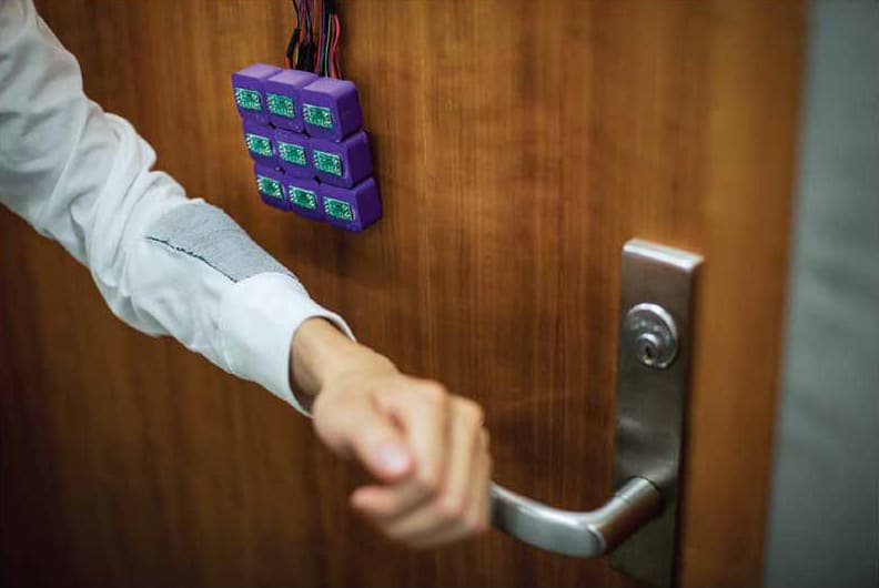 Smart fabric has been created that can store data — from security codes to identification tags — without needing any onboard electronics or sensors. Since it is electronics-free, the fabric can be ironed or put into a washer and dryer. To demonstrate the technology, pass-codes to an electronic door lock were stored on a patch of conductive fabric sewn to a shirt cuff (see figure). The door was unlocked by waving the cuff in front of an array of magnetometers.