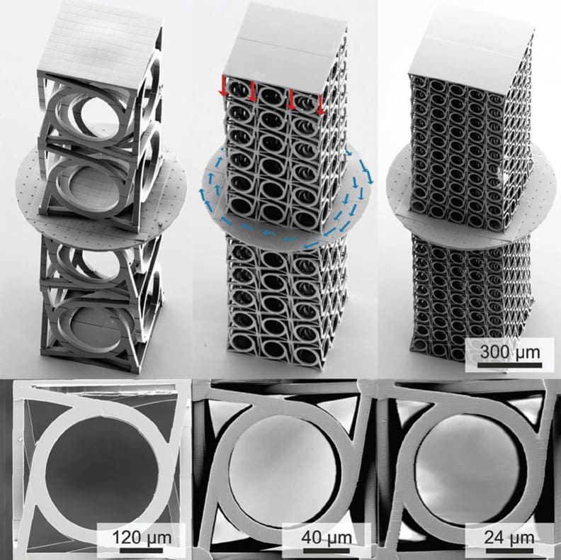 The researchers designed a filigree cubic structure that reacts to loading by a rotation around its axis. Using computer simulation, a design was developed with the new mechanical property. Calculations revealed that the desired behavior is shown by a complex chiral structure, i.e. a structure that cannot be mapped to its mirror image, similar to the left and the right hand.