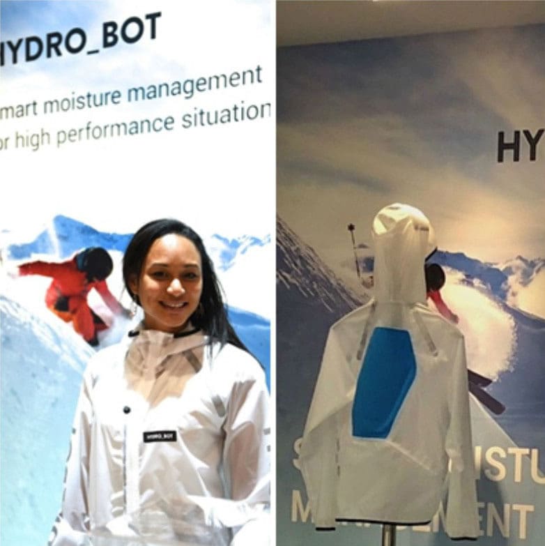 How the electro-osmotic material works: When a 1.5-volt shock is applied to the gold-lined HYDRO_BOT fabric, salt ions (and sweat) migrate through the material’s 20-micrometer-wide polymer membrane, electrically attracted away from the skin and to the outside of the jacket.
