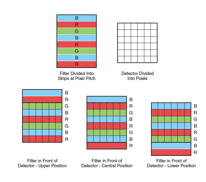 Of course, it would be necessary to time-multiplex the outputs of the pixels for processing in a manner consistent with the spatial and temporal periodicity of the color information acquired by each detector pixel. To simplify the processing, it would be desirable to encode information on the color of the filter strip over each row (or at least over some representative rows) of pixels at a given instant of time in synchronism with the pixel output at that instant. This could be accomplished by means of an alternating pattern of opaque patches over the last two pixel-column positions of each filter strip: for example, nonzero illumination at both of these column positions could signify the presence of the red filter strip, zero illumination at one of these column positions could signify the presence of the green filter strip, and zero illumination at both of these column positions could signify the presence of the blue filter strip.
