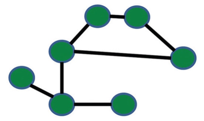 If we eliminate the central hub and connect each of the nodes to each of the other nodes using point-to-point links, we have a mesh topology. Mesh networks can be either fully connected — each node is connected to every other node (Figure 4), or partially connected — only some nodes have connections to more than one node (Figure 5). The multiple connections help increase the network's reliability by providing more than one path to a particular node.