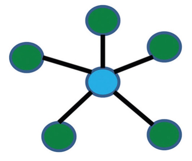 If we use the point-to-point network topology with a centralized hub switch or router, to which each network node is connected, we end up with the star network topology (Figure 3). In the star topology, each network station is indirectly connected to every other node connected to the same hub. This approach, however, requires more cabling and the central hub becomes a single point of failure. In spite of all of the cabling required, with advancements in technology and the transition from coaxial cable to unshielded twisted pair (UTP), the star topology is now relatively easy to set up and maintain.