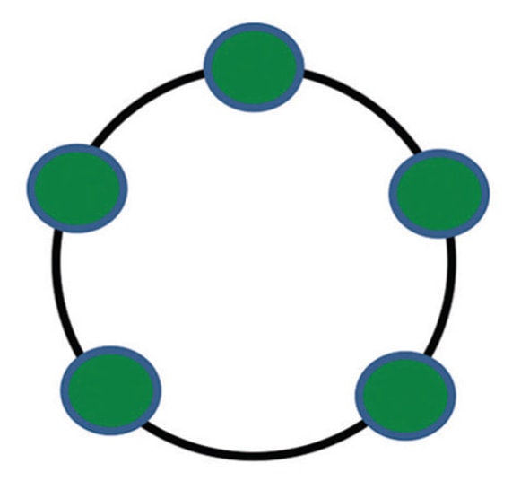 Moving up in complexity, we have the ring topology. Essentially the ring network is like a bus network where the two ends of the cable are connected to each other (Figure 2). Each network station has two connections: one to each of the adjacent network nodes. Collision avoidance in ring networks can be accomplished by time-division multiplexing (TDMA) or with a special three-byte frame called a token. Given that we know the number of nodes on the network, we can determine the maximum amount of time needed to transmit a message.